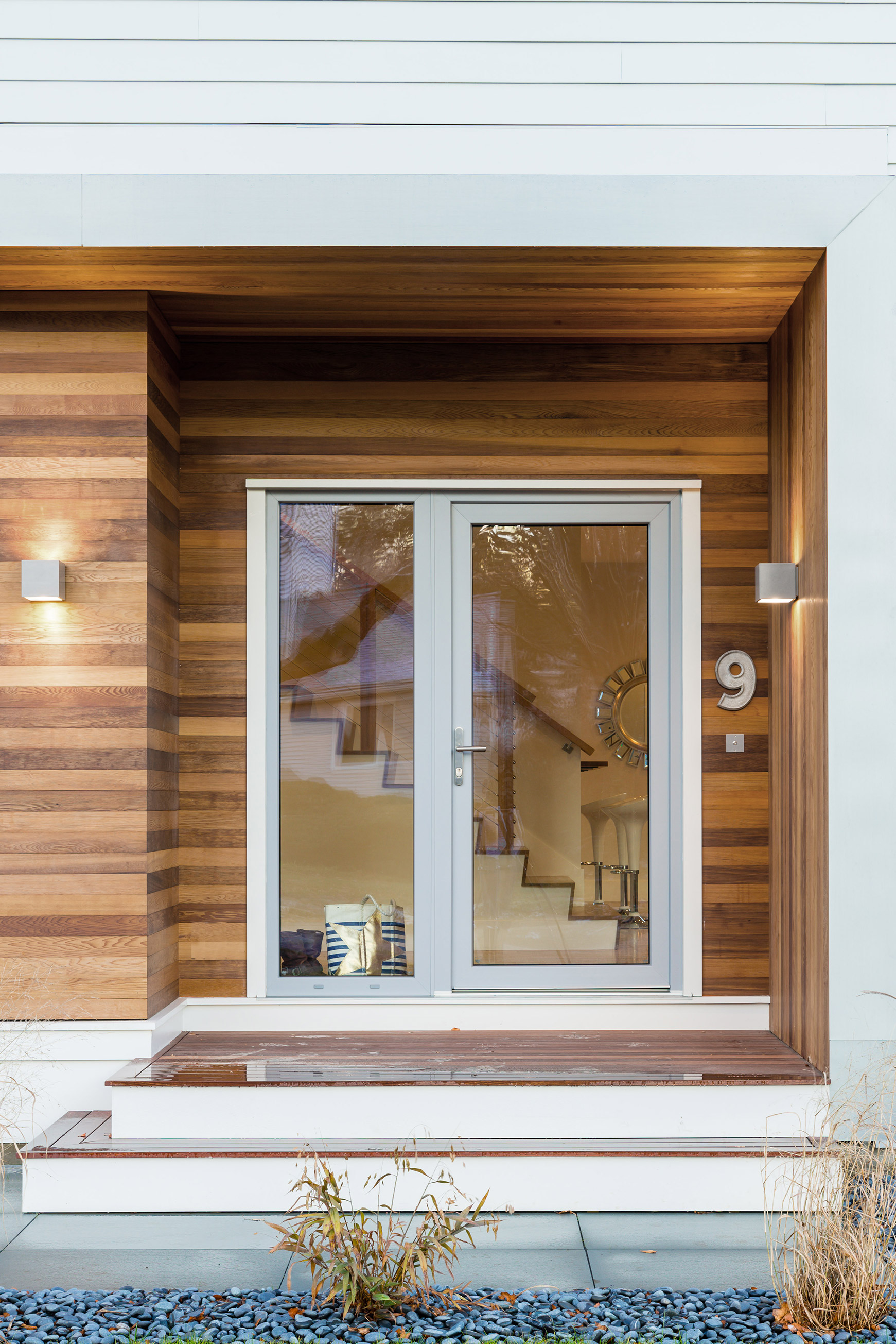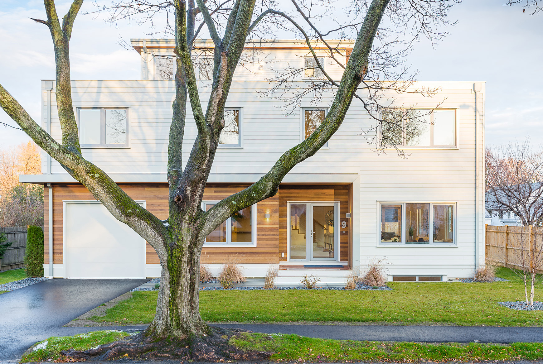 Belmont, MA Restrictive zoning regulations in Belmont, Massachusetts, led us to a contemporary, creative massing solution for this wood-framed, carbon-neutral house. We pushed the boundaries of the boxy, flat-roofed plan, accentuating its horizontality with clapboard and wrapping the indented northwest entry corner in cedar. A half-story head house with a solar array adds height and conceals an office/guestroom with expansive views. An open plan ground floor minimizes circulation space and increases daylight penetration through triple-glazed windows. Generous patios create outdoor rooms.