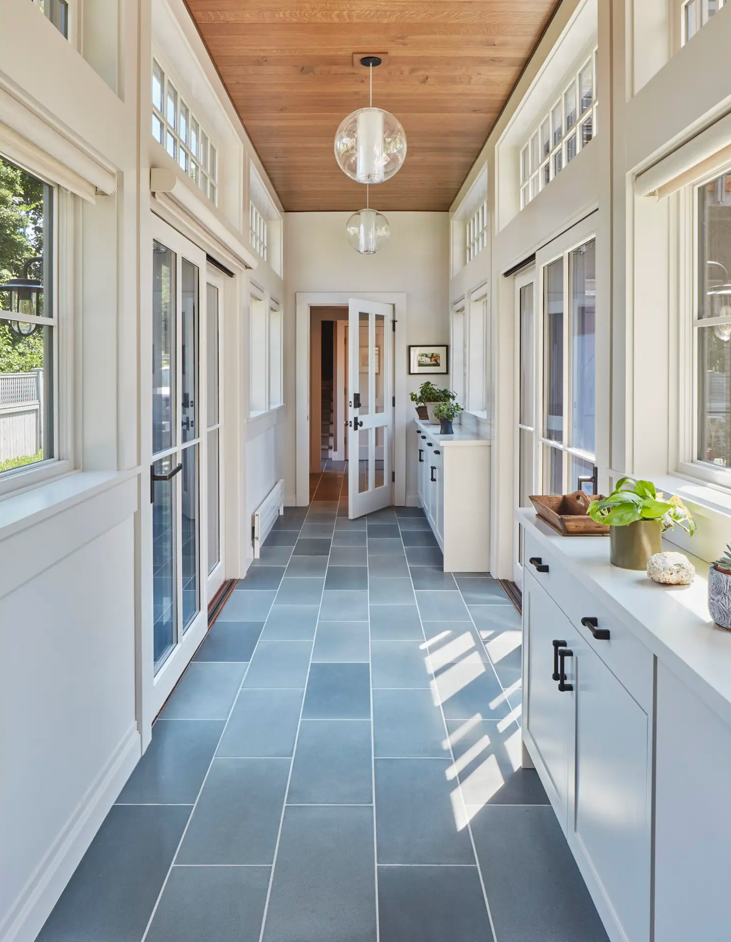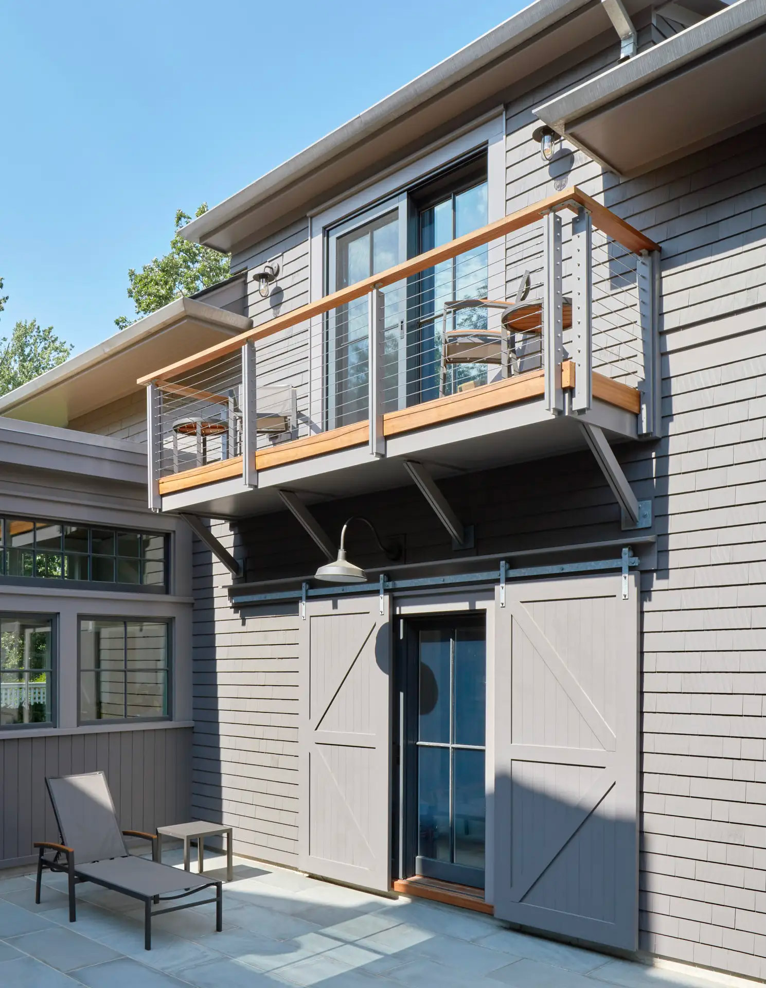 Cambridge, MA This gut renovation of a historical house balances old and new: the exterior received a monochromatic facelift to contemporize the existing architecture; the interior now has a flowing contemporary floor plan that integrates traditional details and materials. An added carriage house and glass-filled connector wrap around a terracing outdoor patio, shielding the back yard from neighbors to create private indoor/outdoor living in a dense Cambridge neighborhood.
