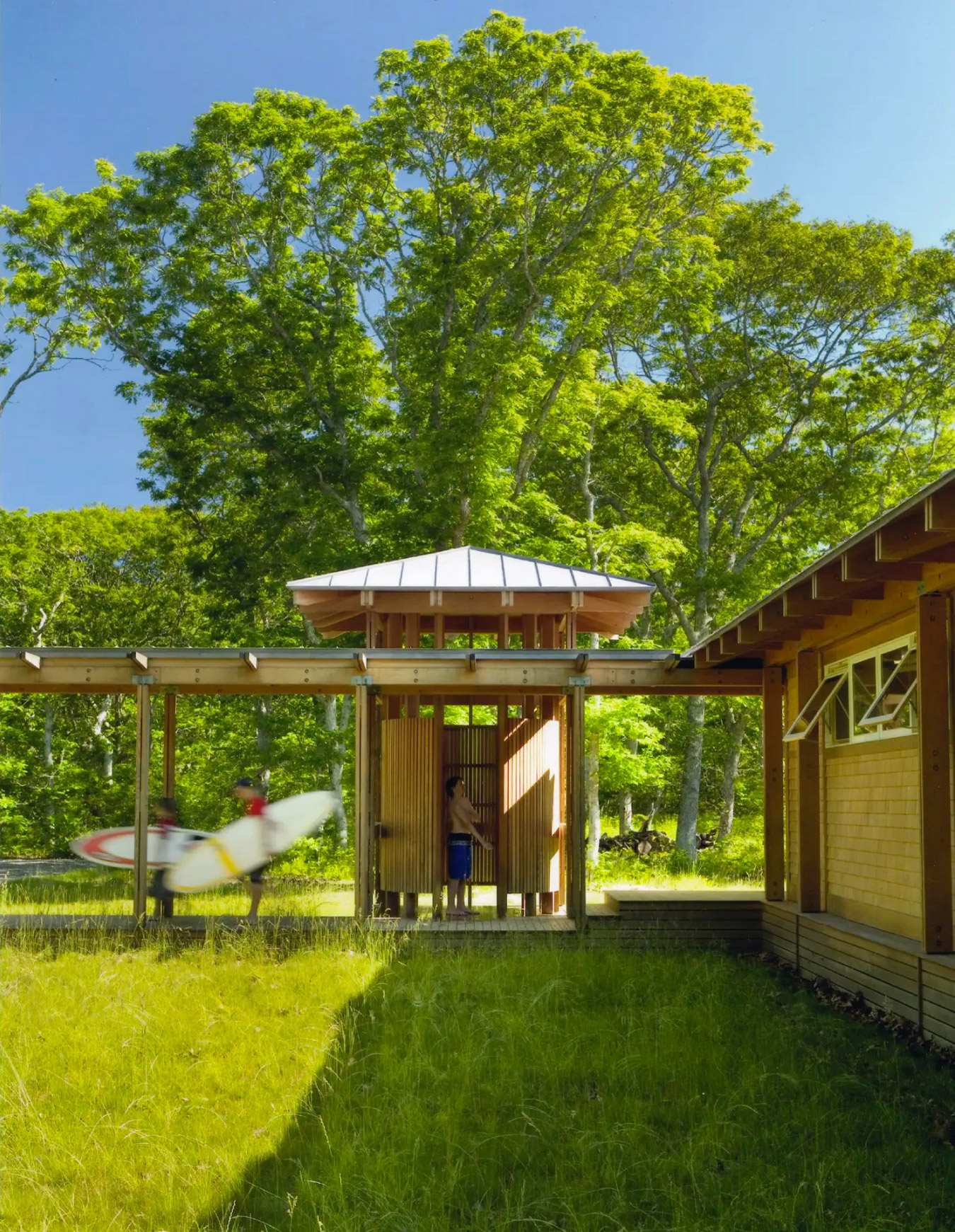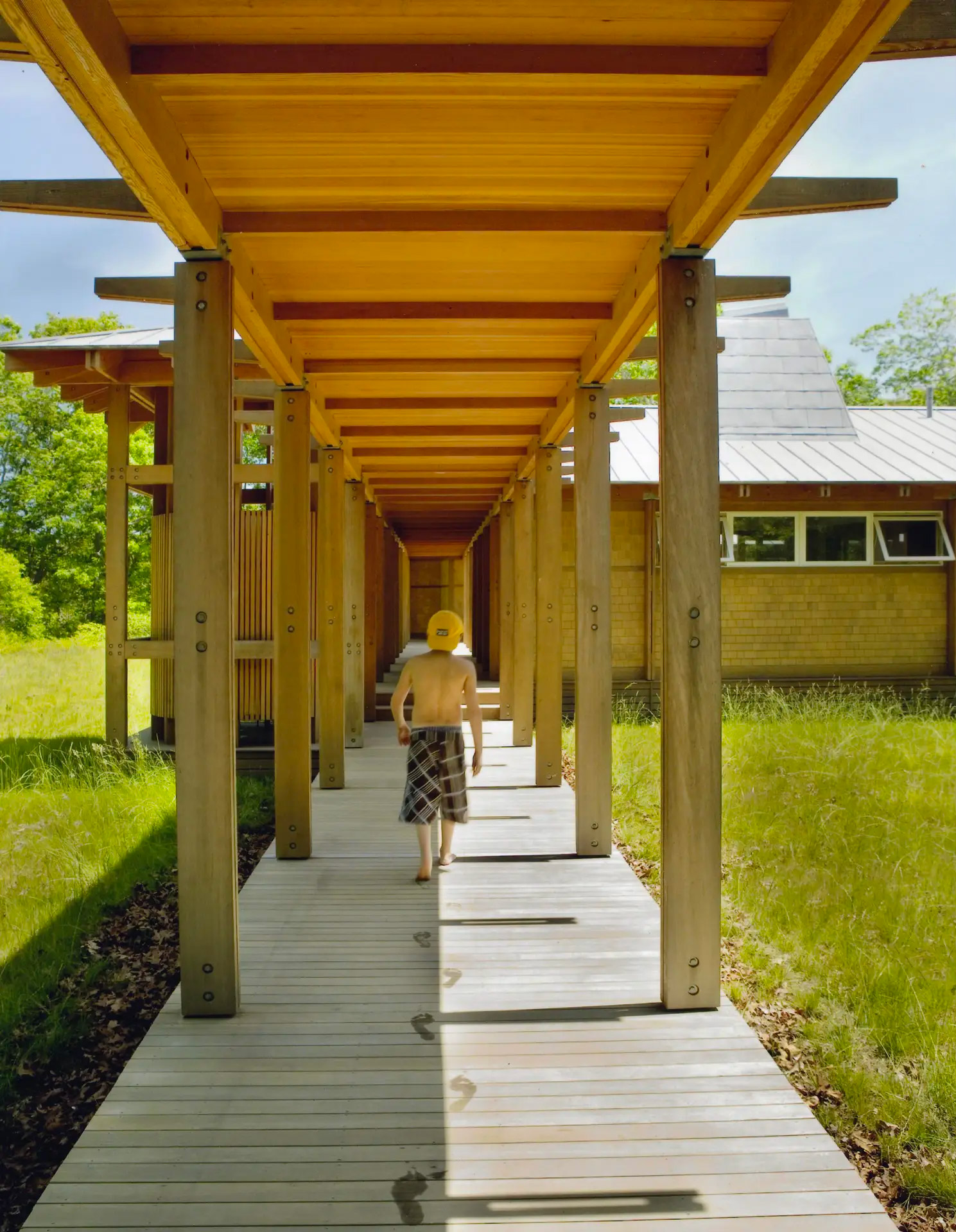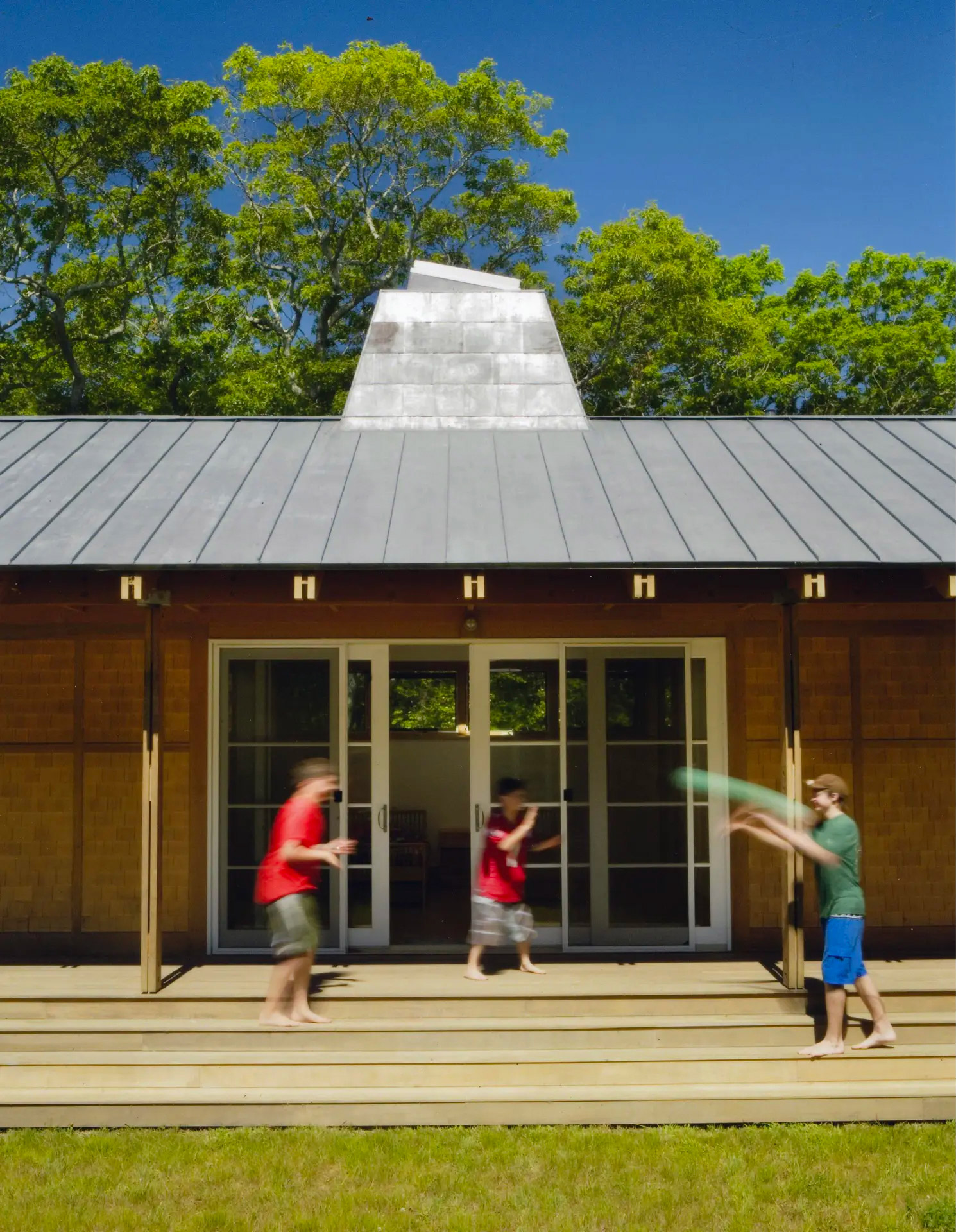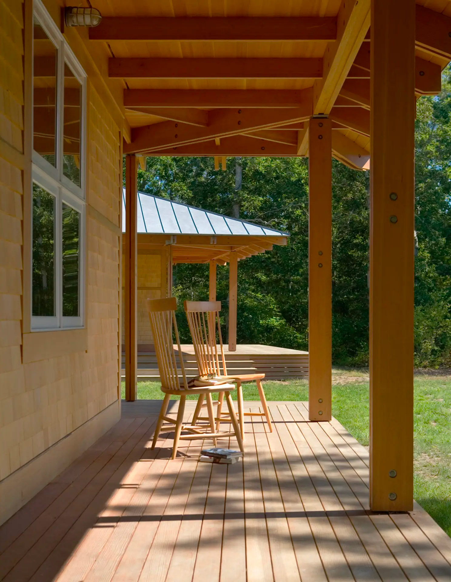 Chilmark, MA Designed for summer living, this two-volume house perfectly articulates Moskow Linn's design philosophy. Our attention to craft, details, choreography, and views combines to create a unique essay in coastal living. For this long, linear site, the view corridor was carved into the scrub oak forest to create an architectural feature. Two low-slung volumes are aligned with the angled property lines and face due south, picking up prevailing breezes. One volume contains three bedrooms, while the other houses a master bedroom and public spaces. A covered arcade connects the two, creating an outdoor room that steps down to the interior courtyard. Deep overhangs help with shading and cooling on hot summer days. Galvanized steel brackets and an expressed exoskeleton celebrate the humble local materials.