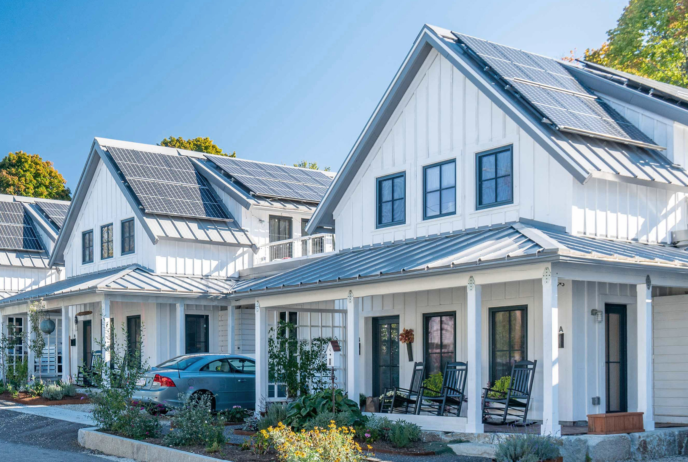 Newburyport, MA The 48 unit net-positive housing project is designed to exceed Passive House and Leed Platinum standards. Constructed with custom designed wall panels built on site, the project includes one, two and three bedroom apartments, common house, community barn, greenhouse and individual growing areas. Three acres of the four and half acre site will be an edible landscape. Solar power generated on site exceeds all the energy needs for the homes and electric vehicles. The first phase is complete and fully rented. The second phase including a ten-unit SRO YWCA is under construction.